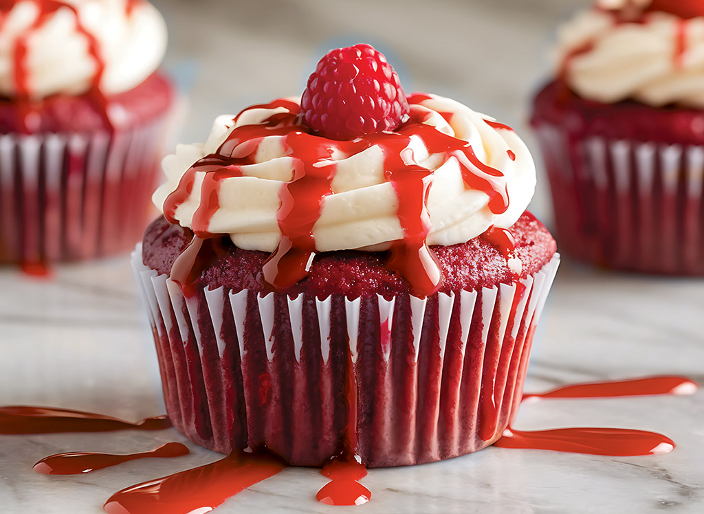 Coloca el betún en una manga y forma espirales sobre cada cupcake, coloca Jarabe sabor paleta de cereza al gusto y una frambuesa para finalizar la decoración.